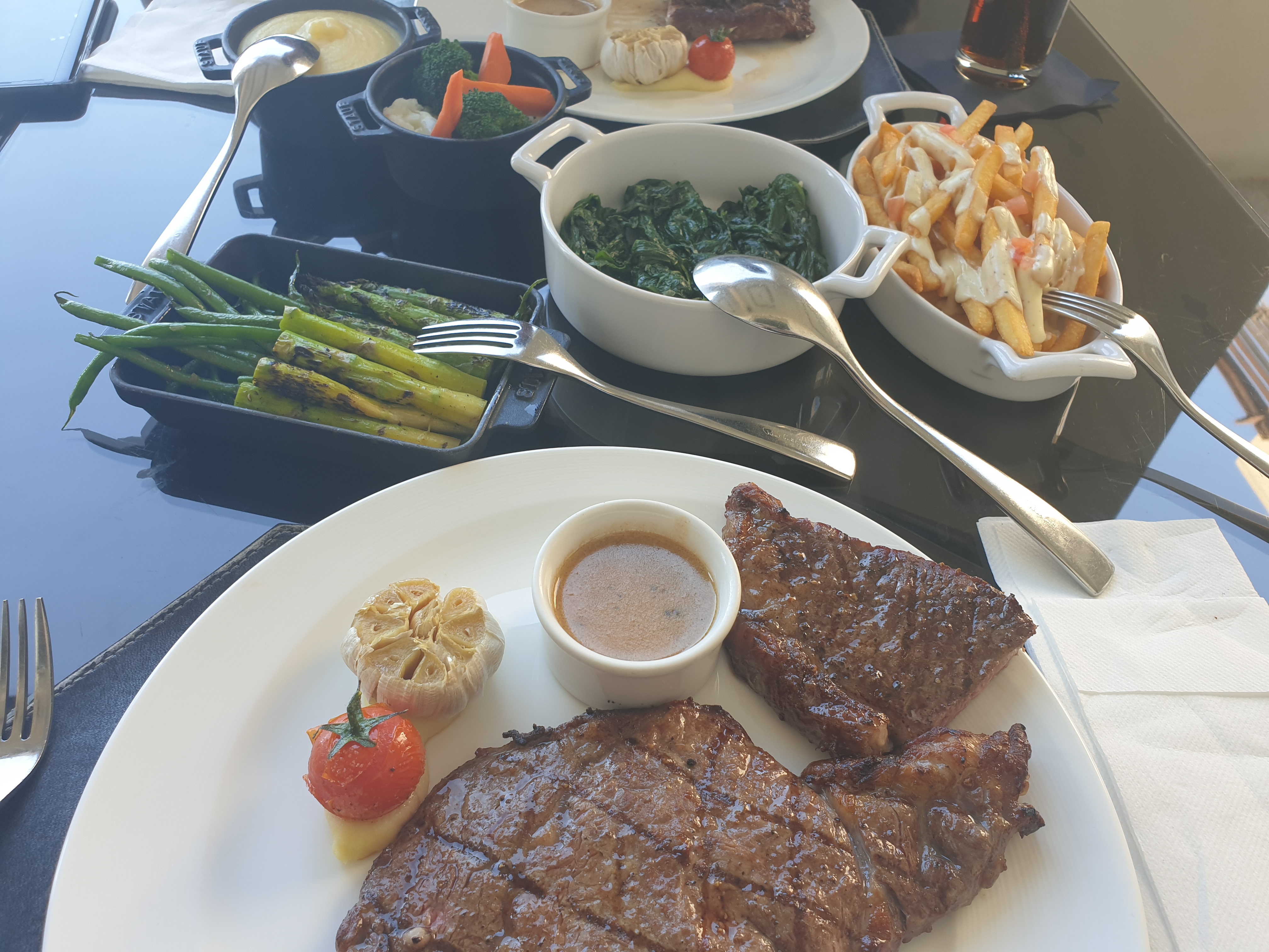 스테이크 함께 나온 아스파라거스와 시금치